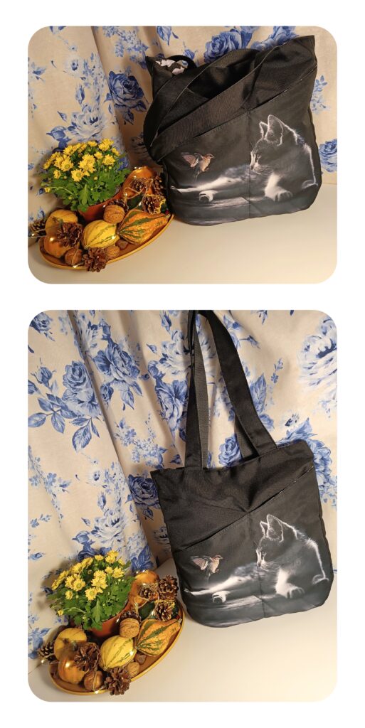 Párkrát nošená, vypraná, funkční, někomu ještě poslouží. Hodí se třeba na sběr hub, když už se to nevejde do košíku, nebo jablek u cesty, ořechů apod. Prostě taková obyčejná látková taška přes rameno nebo na kříž, na které jsem se před lety učila základy šití v mých začátcích. Je pevná, hodně unese.