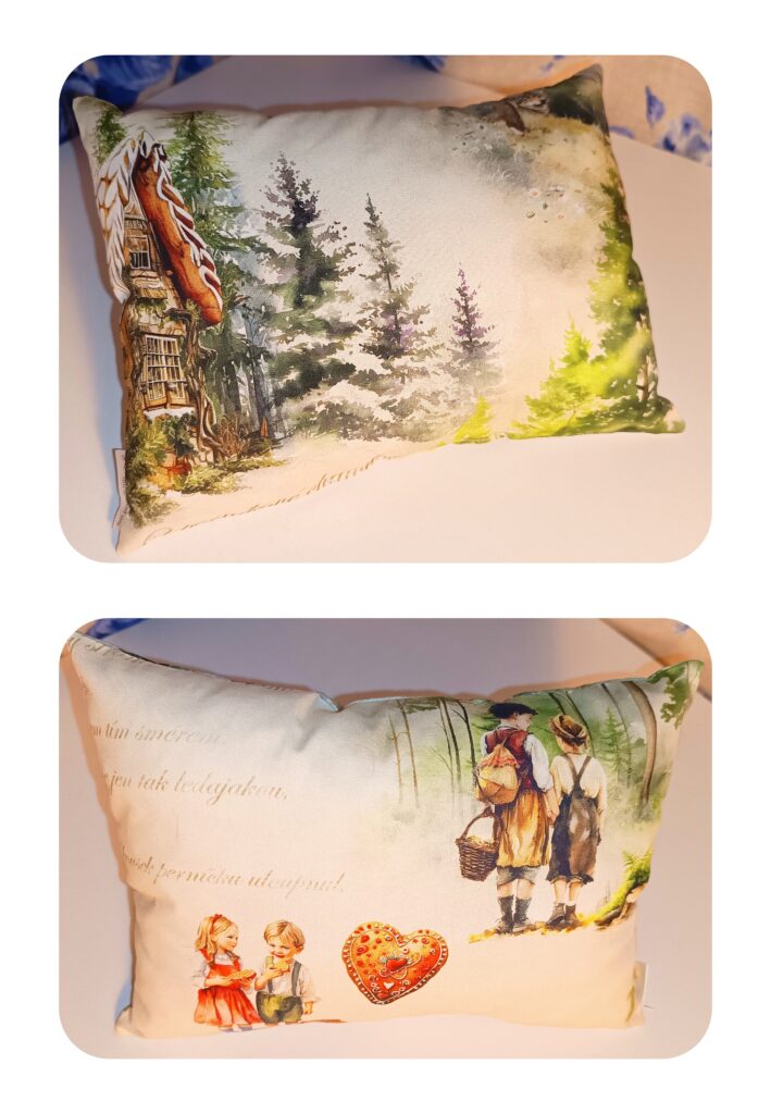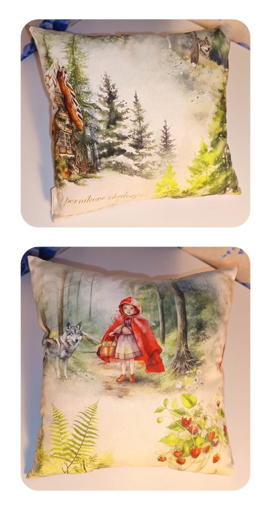 Polštářek s pohádkovou tématikou – O perníkové chaloupce a O červené Karkulce