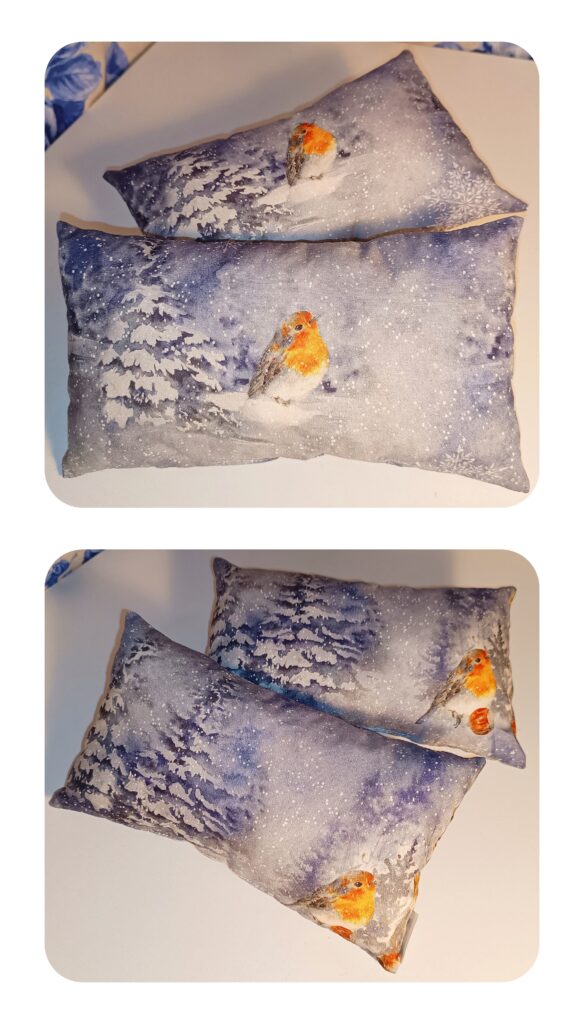 Polštářek se zimní tématikou – ptáček v zasněženém lese