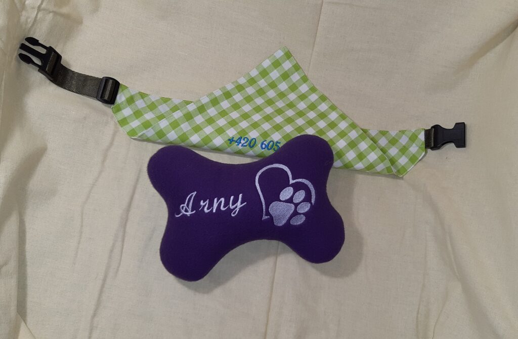 Kdo nechce klasický obojek, může mít i parádní šáteček s obojkem v jednom. Jméno pejska vyšívám na horní stranu, na spodní stranu vyšívám kontakt na majitele (stačí šáteček ohrnout a ztracený pejsek bude díky kontaktu na páníčka brzy zpět u svého majitele bez stresu z útulku)