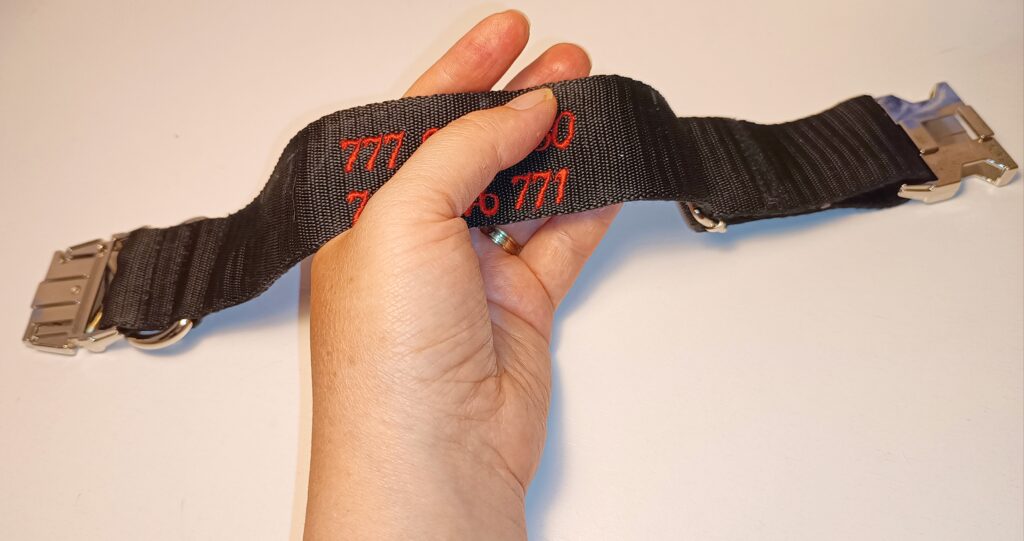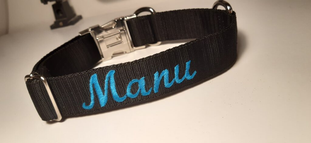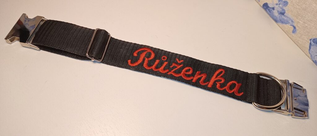 Šíteček na většího psa, horní strana s vyšitým jménem pejska, spodní strana s vyšitým kontaktem na páníčkaObojek na většího psa s vyšitým jménem