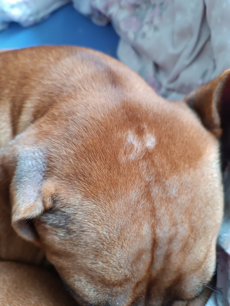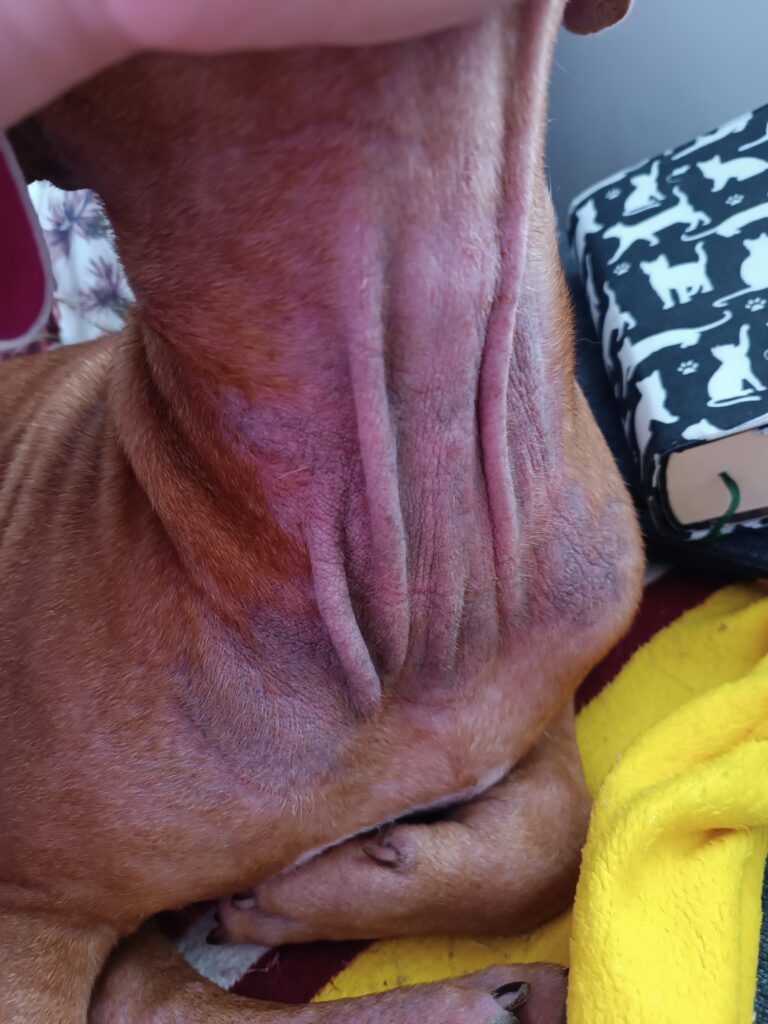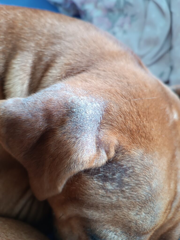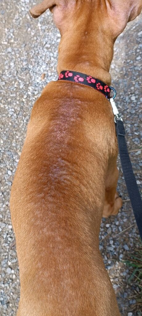 Ztratila srst na krku a části hrudi, uších, tlapkách …. jednu dobu jí krk a uši mokvaly, strašně to smrdělo léky nezabíraly. Po pár dnech se krk maličko zlepšil, když jsem to potírala dubovou kůrou i několikrát do hodiny. Nemůže mít kvůli tomu obojek, takže jsme ho vyměnili za kšíry (což je na východu katastrofa u bulla plného energie). Krk stálě potírám odvarem z dubové kůry a uši denně až ob den čistím, protože je má neustále plné bordelu (svrab to není).